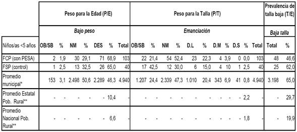 En este estudio se evaluó el estado de nutrición niños/as menores de 5 años. La evaluación consideró 103 niños/as de familias con PESA (FCP) y 40 niños/as de las familias control (FC). En el Cuadro Nº 1 se comparan los resultados obtenidos con el promedio municipal y nacional de indicadores nutricionales de población infantil que vive en zona rural.