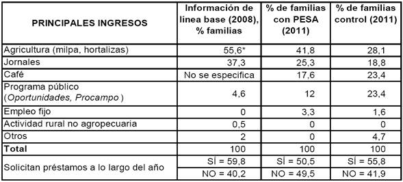 En los resultados de línea base del 2008, se tiene que más del 50% de las familias obtuvo ingresos de la agricultura, sin embargo no se cuenta con información que diferencie los ingresos obtenidos por la producción hortícola, la milpa o la venta de café. Como se puede observar en el Cuadro Nº 2, para el año 2011 se encontró que el 41,8% de las familias con PESA (FCP) obtienen sus principales ingresos de la actividad agrícola y el 17,6% de la venta de café. En las familias control (FC) el 28% obtiene sus ingresos de la agricultura seguido de la venta de café (23,4%). Se observa una mayor proporción de familias que obtuvieron ingresos por jornales en 2008 en relación con el 2011. Además se encontró, que el 23% de las familias control (FC) dependen de manera importante de los ingresos obtenidos a través de programas de transferencia monetaria condicionadas en relación con el 12% de las Familias con PESA.