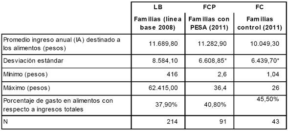 Al comparar las familias con PESA (FCP) y familias control (FC) no se hallaron diferencias estadísticamente significativas entre las desviaciones estándar ni en las medias (1- = 0,95). Esto quiere decir que ambos grupos destinan una proporción similar de los ingresos anuales para la compra de alimentos.