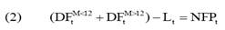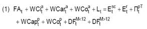 In equation (1), the left hand side represents investment, in which FA is fixed assets, WCia is working capital asset inventories, WCara is working capital asset accounts receivable, WCoa is working capital asset-other assets, and L is liquidity. The sources of capital are represented on the right hand side of equation (1) where Esc is share capital, Er are reserves, PpT is profit after tax, WCapp is working capital debt accounts payable, WCop is working capital debt, other values, DFM<12 is financial debt due within 12 months and DFM>12 is financial debt due after 12 months. The left hand side of equation (1) is total assets (TA), while the right hand side represents the total sources of capital, quantified as the total equity capital (ET = Esc + Er + PpT) and the total of debt capital (DT = WCapp + WCop + DFM<12 + DFM>12). Net financial position (NFPt) could be expressed as follows: