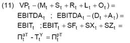 In equation (11), EBITDA approximates the creation of liquidity, with an income approach before non-monetary costs (Dt + At); EBITDA even considers non-monetary values (DIt,t"1) of VP and thus does not directly express an operating cash flow margin but approximates it. EBIT is an income margin that expresses operative income after non-monetary costs (Dt + At); ΠtaT is profit before taxes and ΠtpTt (PROFIT) expresses the firm's capacity to remunerate equity capital; TYt represents income taxes.