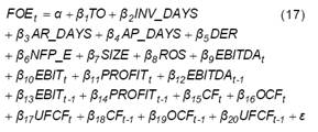 The financial model, as expressed in regression equation (17), is analyzed in Table Nº 8 and assumes a significant statistical capacity to explain FOEt values. The F statistic has high significance (F = 0.000). R2 is 0.965, while adjusted R2 has a value of 0.962. The model is then useful in explaining the greater part of FOEt variability. The DW statistic is 2.052, and the majority of the variables are significant. First, TO has a positive effect on FOE values, expressing that an increase in turnover -that is a decrease in the capital-intensive structure of assets- increases the FCFE value. Explanatory variables of FOE generation are values that express working capital (WC) cycle durations. Particularly, INV_DAYS and AR_DAYS have a negative sign, where an increase in WC durations has a negative effect on the FOE result, with a decrease available cash flow. AP_DAYS has a positive sign on the FOE, expressing an opposite situation. DER has a positive sign on the FOE, given that debt increasing generates cash, while an increase in financial debt (NFP_E) has an effect on increasing interest charges, thus reducing cash flow available. Income and financial margins at a given time, t, have an effect on FOE at the same time, t (particularly PROFITt and UFCFt). Income and financial margins at t-1 have a limited effect on FOE, with the exception of variables PROFITt"1 and UFCFt"1 with a relation significant only at the 0.05 level (twotailed).