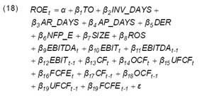 The second considered regression model (income model) analyzes the relation between the return on equity capital for a given period, t (ROEt); that is, the amount of PROFIT available for equity holders, and a set of independent variables, the same considered in the financial regression model, as expressed in the methodological part of the article. In the income regression model, the constant term is a, TO is turnover (VP / invested capital), INV_DAYS is the duration in days of the cycle of the inventories in stock, AR_DAYS is the duration in days of the average extension to customers, AP_DAYS is the duration in days of the average extension from suppliers, DER is debt-to-equity ratio (D/E), NFP_E is net financial position to equity ratio (NFP/E), and SIZE is the amount of the capital invested in euro (total assets). The model then considers EBITDA and EBIT as explanatory variables, considered in values for the years t and t-1 (EBITDAt and EBITDAt"1, EBITt). PROFIT is not considered as an explanatory variable, as it is part of the ROE equation. Financial margins CF, OCF, UFCF, and FCFE are considered explanatory variables in their values for years t and t-1, giving then another eight explanatory variables (CFt and CFt"1, OCFt and OCFt"1, UFCFt and UFCFt"1, and FCFEt and FCEFt"1). In the income model, the set of explanatory variables is the same as in equation (17), with the exception of FCFE instead of PROFIT. We express the income model as follows: