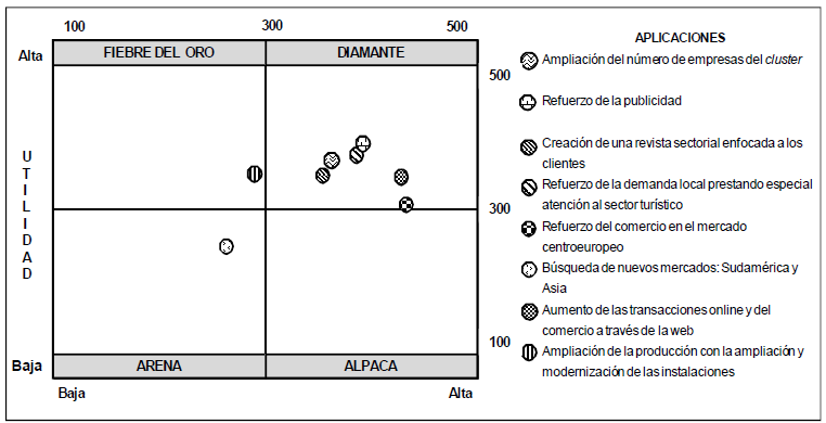 La factibilidad es una medida que indica hasta qué punto puede resultar posible el desarrollo de las estrategias y, consecuentemente, su grado de complejidad. Por su parte, la utilidad es una medida que indica el grado en que puede contribuir cada estrategia a los objetivos fijados. La posición más ventajosa corresponde al cuadrante superior derecho (diamante), pues la relación factibilidad-utilidad es alta, mientras que la más desfavorable se refleja en el cuadrante inferior izquierdo (arena). Los dos cuadrantes restantes (fiebre del oro y alpaca) representan posiciones intermedias con un elevado grado de incertidumbre que es necesario evaluar con mayor detalle.