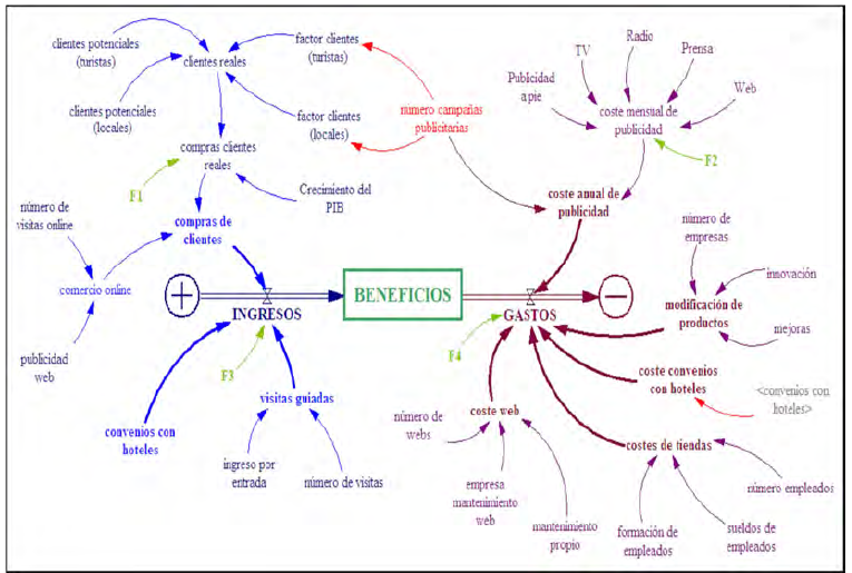Con objeto de analizar la posible evolución de las estrategias escogidas a lo largo del tiempo se hace uso de la dinámica de sistemas. Como se ha comentado, la dinámica de sistemas es una técnica de análisis que puede ser efectuada mediante ordenador y que permite estudiar el comportamiento de sistemas complejos a lo largo del tiempo, haciendo uso de ciclos de realimentación y modelos matemáticos. Se ha adoptado el software Vensim para efectuar la simulación. El modelo recogido en la Figura Nº 2 muestra las diferentes variables, así como las relaciones entre estas, que participan en las dos estrategias. Se ha adoptado la variable beneficio como medio de evaluar si los resultados previsibles permiten cumplir la estrategia de incrementar los beneficios globales del sector en torno a un 20% en un periodo de 5 años.