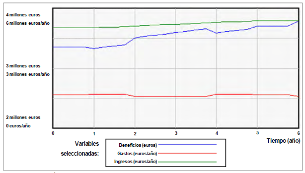 Introduciendo en el modelo datos obtenidos de las empresas más representativas del sector se puede obtener resultados estimados que reflejan la posible evolución de las principales variables estudiadas. Dado que el entorno puede influir decisivamente en los resultados obtenidos en la variable beneficios se ha considerado oportuno el desarrollo de distintos escenarios. A título de ejemplo, la Figura Nº 3 muestra la evolución previsible de tres variables básicas del modelo (beneficios, ingresos y gastos), bajo el supuesto de un escenario continuista sin cambios significativos en las variables del entorno.