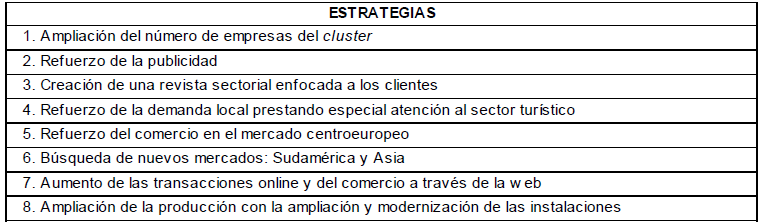 Continuando con el proceso estratégico, la fijación de fines cualitativos, y su concreción por medio de objetivos cuantitativos, ha de ir asociada a una serie de estrategias que constituyen las formas en las que se pretende materializar los objetivos planteados. En este sentido, entre las estrategias que se consideran adecuadas para el logro del objetivo de incrementar el beneficio económico del sector en al menos el 20% para el periodo considerado, se han planteado las que figuran en el Cuadro Nº 1. Dichas estrategias tienen su razón de ser en que se encuentran estrechamente ligadas a varios de los factores críticos para el éxito identificados previamente, como son las relaciones con el sector turístico, la técnicas publicitarias y el comercio electrónico a través del entorno web.
