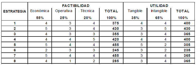 En cuanto a la utilidad, esta se trata también de una variable agregada a la que debe darse un valor que sirva para poder comparar distintas soluciones estratégicas. Se ha optado por evaluar la utilidad a partir de dos dimensiones: utilidad tangible e intangible. La utilidad tangible hace referencia a todos los retornos cuantificables, especialmente los de tipo económico; mientras que la utilidad intangible refleja aquellos beneficios difícilmente contabilizables, como puede ser el aprendizaje, la experiencia o la imagen de marca. Todas las valoraciones ponderadas que se han realizado se muestran en el Cuadro Nº 2, donde las estrategias se han numerado de acuerdo con lo reflejado en el Cuadro Nº 1.