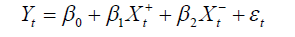Como resultado, dois coeficientes são estimados na Equação 1, um para acréscimos (β1) e outro para decréscimos ( β2 ) nos preços. Assim, a transmissão simétrica de preços é rejeitada se β1 e β2 forem significativamente diferentes. Como uma crítica ao trabalho de Tweeten & Quance (1969), Wolffram (1971) propôs outra técnica de segmentação ao incluir a primeira diferença dos valores da variável independente.
