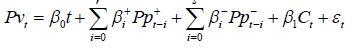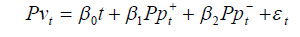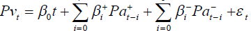 Se β0 não for zero, aparece na Equação 2 como um coeficiente de tendência. Se alguma outra variável afetasse Pvt, elas também seriam inseridas na Equação 2 como desvios a partir do valor inicial. Para se constatar a assimetria no ajustamento dos preços deve-se rejeitar a hipótese nula de que β1 = β2 a determinado nível de significância, o que é indício de mercado menos competitivo (Houck, 1977).