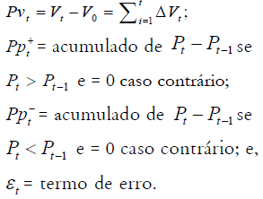 ) sejam transmitidas para os preços do varejo ( Pvt ). A variável Pvt é construída a partir das variações em termos absolutos no decorrer do tempo em relação ao preço inicial. As variáveis Ppt e Ppt são obtidas a partir da somatória das diferenças do aumento (ou da diminuição) do preço atual em relação ao anterior.