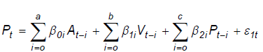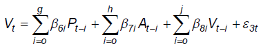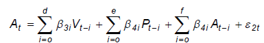 (6)O teste para se verificar se os preços de atacado causam os preços ao produtor, por exemplo, consiste em testar se os coeficientes de At são nulos na Equação 4, o que pode ser feito por meio do teste F. Nota-se que as variáveis são mutuamente influenciadas uma pelas outras, contemporaneamente e pelos seus valores defasados.