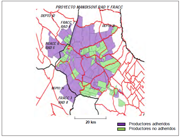 Sobre un total de 59 productores adheridos, el 39 % pertenece a la Colonia La Fraternidad 44 % a la C. Santa María, y el 17 % a C. Oficial Nº 20. Por su parte, entre los «no adheridos» al Proyecto se encuentran 81 productores ganaderos medianos y pequeños, así como citricultores de las dos Colonias restantes (San Ramón y Calel La Florida), ubicadas en una zona donde es mayor la posibilidad de regar utilizando una fuente subterránea.