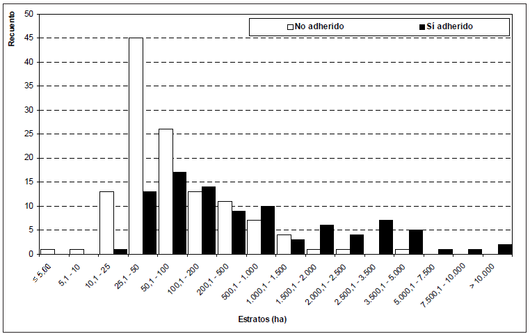 Existe también una relación significativa entre aquellos productores que se adhirieron al Proyecto y la escala de la explotación (p < 0,05). En escalas menores a 50 ha el nivel de adhesión es casi nulo, mientras que a partir de 100 hasta 500 ha los porcentajes de adheridos o no son similares. En contraste, a partir de 500 ha es superior el porcentaje de los que adhieren (Figura Nº 3).