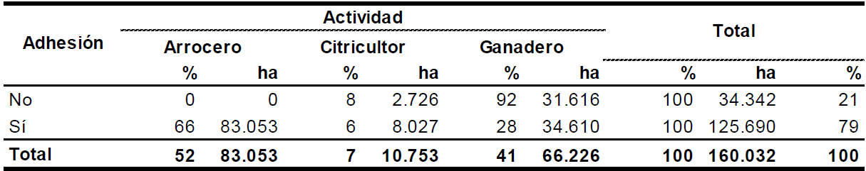 Del total de la superficie, el 79% pertenece a explotaciones que manifestaron su adhesión, ocupando el 66% del área productores arroceros. Para estos la seguridad de disponer de agua disminuye la incertidumbre de la superficie a sembrar, el 6% la demandan para la citricultura de exportación y el 28% restante son tierras pertenecientes a productores que proyectan incorporar el cultivo de arroz.