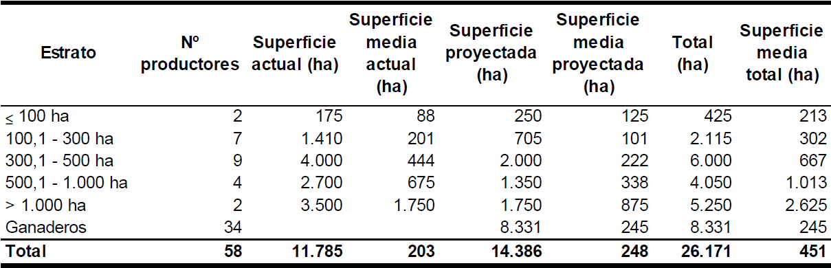 La superficie actual de arroz son 11.785 ha y la proyectada implicaría 14.386 ha adicionales (Cuadro Nº 3). En el caso de la citricultura se siembran 2.408,5 ha, superficie que se incrementaría en 1.277 ha. El Proyecto involucra productores con distinta orientación productiva, tamaño de sus explotaciones y organización de su producción, lo que implica diferentes sistemas de producción, tecnología y organización del proceso de trabajo.