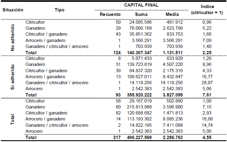 Se observa que el carácter familiar de las explotaciones se encuentra relacionado con el estrato de superficie que opera, con la actividad y con la condición de adherido o no al Proyecto. Los estratos de superficie más pequeños están asociados con la gestión familiar de la explotación, así como la actividad exclusiva de citricultura y la citricultura combinada con la ganadería. Las explotaciones en donde predomina la ganadería son claramente familiares en los productores no adheridos y empresariales en los productores adheridos, mientras que en los ganaderos arroceros, adheridos al Proyecto casi en su totalidad prevalece una organización empresarial de su actividad económica productiva.
