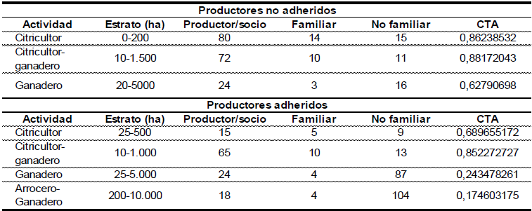 Para analizar la influencia que la orientación productiva tiene sobre el comportamiento de los productores, se agruparon las actividades, con mayor representatividad en la zona de influencia, en cinco categorías según la actividad productiva predominante y la adhesión o no al Proyecto: 1. Productor arrocero-ganadero; 2. Productor ganadero (exclusivamente ganaderos); 3. Productor citrícola (exclusivamente citricultores); 4. Productor ganadero-citrícola; y, 5. Productor arrocero– ganadero-citrícola. Esto determinó diferentes estratos representativos en las diferentes actividades productivas.