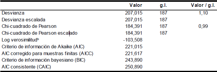 El cociente de desvianza por sus grados de libertad, que resulta próximo a 1, estaría indicando que no existe sobredispersión y que el ajuste es adecuado, al igual que para el Chi-cuadrado de Pearson. Por esto resultó el elegido, además de presentar los dos criterios (AIC y BIC) más pequeños (Cuadros Nº 8 y Nº 9).