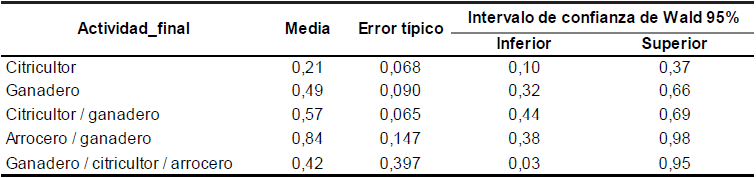 El tipo de actividad, el índice de Capitalización y el índice IMO presentan efectos estadísticamente significativos sobre la adherencia (P < 0,05) (Nº variables incluidas en el modelo. El tipo de actividad presentó un efecto altamente significativo en el modelo (p-value < 0,01) (Cuadros Nº 9 y Nº 10) sobre la decisión de adherirse o no al Proyecto. La estimación de los parámetros para estas variables indicaron que las explotaciones dedicadas solamente a la citricultura tendrán menor nivel de adhesión al Proyecto que actividades conjuntas arrocera-ganadera (con probabilidad de adhesión tendiendo a 1); e inclusive, los de actividad citrícola-ganadera.