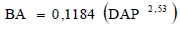 DAP = diâmetro da altura do peito (cm); e, 0,1184 e 2,53 = constantes.