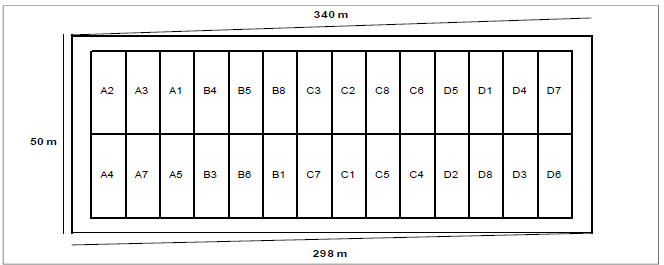 Conforme a Figura Nº 1 é possível observar as quatro repetições, identificadas como A, B, C e D, sendo que os oito tratamentos são organizados por números, sendo: 1 - Testemunha, no monocultivo; 2 - Moringa oleifera; 3 - Croton floribundus; 4 - Trema micrantha; 5 - Gliricidia sepium; 6 - Senna macranthera; 7 - Heliocarpus popayanensis; 8 - Mimosa Scabrella. °