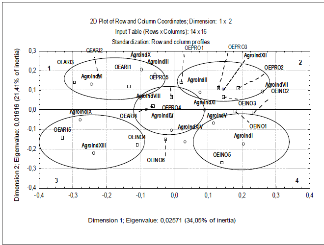 No quadrante 2 da Figura Nº 2 pode-se observar que existe as sociação entre as agroindústrias nominadas como AgroIndII, AgroIndVII e AgroIndXII com os indicadores OEPRO1, OEPRO2, OEPRO3 e OEINO3. Desta maneira, estas empresas associam-se com tomadas de decisões a frente de seus concorrentes, introduzindo novos produtos, serviços, técnicas administrativas, tecnologias operacionais, entre ou tra s. Por outro prisma, quando os concorrentes iniciam ações no mercado, as gestões das agroindústrias AgroIndI I, AgroIndVII e AgroIndXII tendem a tomar decisões como resposta imediata.