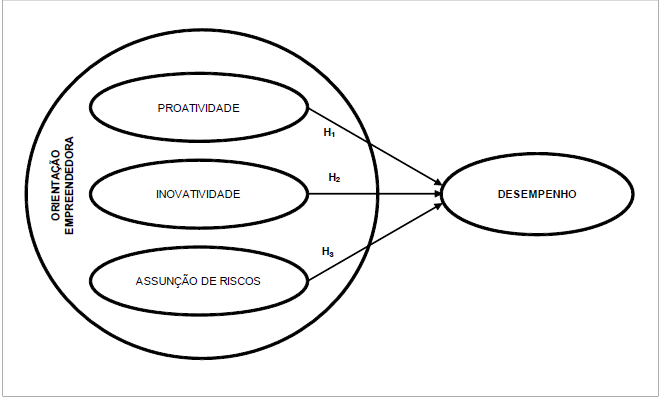 Martens, Freitas & Boissin (2010) destacam que grande parte dos estudos sobre a temática tem adotado as três dimensões propostas por Miller (1983). A exemplo desta informação, observa-se a pesquisa de Escobar, Lizote & Verdinelli (2012) quando apontam que os estudos de Covin & Slevin (1991), Zahra & Covin (1995), Mello et al. (2006), Wiklund & Shepherd (2005), e Mariano (2011) também valeram-se das dimensões propostas por Miller (1983). Ademais, torna-se importante destacar que a pesquisa de Escobar et al. (2012) também amparou-se nesta configuração.