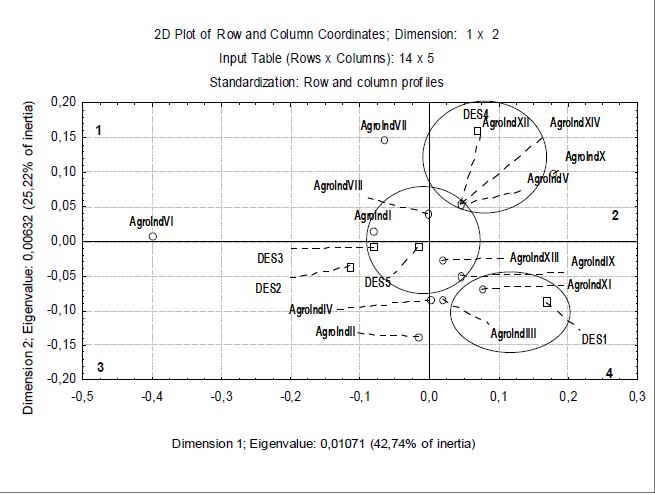 Já as empresas AgroIndV, AgroIndX, AgroIndXII, AgroIndXIV, apresentam correspondência com a variável Des4. Estas agroindústrias demonstram ter associação com o desempenho em termos de faturamento mensal. Tais apontamentos podem ser observados no quadrante 2 da Figura Nº 3. O indicador de desempenho Des1 é identificado com forte correspondência com a empresa AgroIndXI e com menor intensidade com as empresas AgroIndXIII, AgroIndIX, AgroIndIII. Estes resultados apontam para o desempenho em função da lucratividade destas agroindústrias. Neste sentido, a AgroIndXI parece possuir resultados, em termos de lucro, com maior proeminência. A Figura Nº 3, quadrante 4, demonstra estas associações.