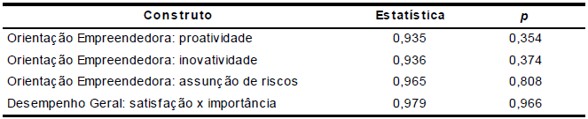 Após a identificação da associação das agroindústrias com os indicadores, de maneira individual, objetivando explorar as relações e conhecer o posicionamento dos gestores de maneira particular, realizou-se o teste de normalidade de Shapiro-Wilk. Assim, após a realização dos cálculos, observou-se que os resultados da estatística do teste é: i) 0,935 para orientação empreendedora – proatividade; ii) 0,936 para orientação empreendedora - inovatividade; iii) 0,9365 para orientação empreendedora – assunção de riscos; e; iv) 0,979 para desempenho geral – satisfação x importância. Já os valores do p-value para estes construtos foram de 0,354; 0,374; 0,808 e 0,966, respectivamente. Como os valores de p > 0,05 em todos os construtos, não se rejeita a hipótese nula, concluindo que a distribuição de dados é normal. Tais informações são apresentadas no Quadro Nº 1.