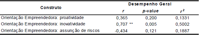 Os resultados encontrados parecem ser contraditórios com os apontamentos de Rauch et al. (2009). Segundo esses autores, as dimensões da orientação empreendedora (proatividade, inovatividade, assunção de riscos) geram desempenho das organizações. Embora só tenha sido possível confirmar os resultados da dimensão inovatividade, observa-se que a dimensão assunção de riscos apresentou coeficiente de correlação negativo com o desempenho