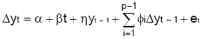 (4)Sendo ΔyT, a variável testada na primeira diferença; á a constante; βt o parâmetro com tendência determinística; Δyt-i a variável defasada com seu parâmetro ç; Δyt-i a variável defasada no processo auto regressivo e na primeira diferença, com parâmetro ϕi; et o termo de erro.