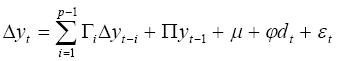 (5)Onde yt é um vetor (k x 1) de variáveis I(1), e o εt ~ N(0, Σ) e E(εt εs') = 0 para qualquer t diferente de s, sendo dt um vetor de variáveis binárias para captar a variação estacional.