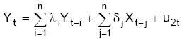 (7)Sendo Xt e Yt variáveis dependentes de cada sistema auto-regressivo; Xt-i, Xt-j, Yt-i e Yt-j as variáveis defasadas de ordem i, j; αi, βj, λi, δj, os parâmetros de Xt-i e Yt-i em cada sistema autorregressivo; e u1t e u2t os termos e erros dos processos autorregressivos.