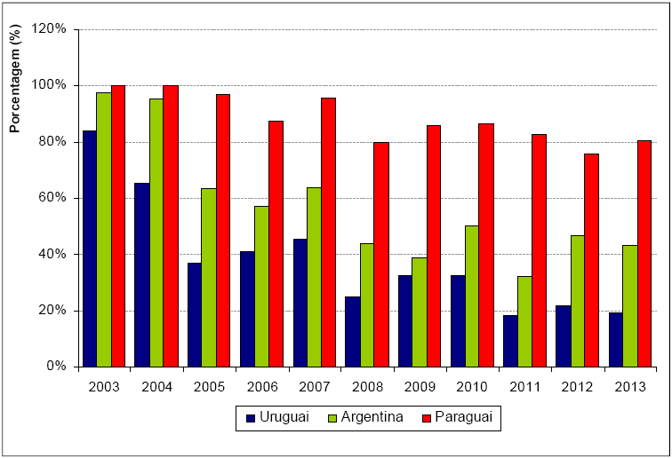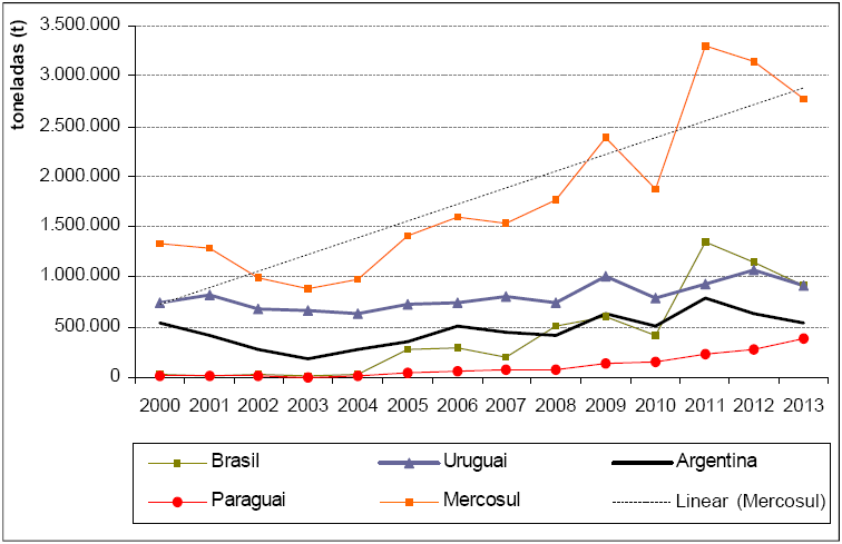 Em terceiro lugar, embora com produção anual ainda próxima de 0,6 milhão de toneladas, o Paraguai vem expandindo suas áreas de produção, tendo ampliado em quase oito vezes suas exportações em apenas uma década (FAO, 2014). Conforme demonstra o Gráfico Nº 2, o principal mercado dos três países do Mercosul ainda é o Brasil, porém, com gradual redução de participação.