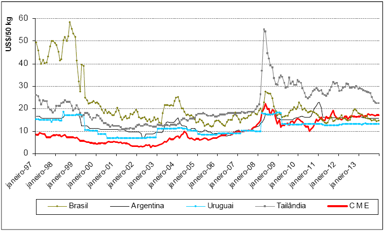 Os preços domésticos brasileiros foram coletados junto à CONAB (2013), e referem-se aos preços pagos aos produtores no Rio Grande do Sul. Os preços argentinos foram coletados no Ministério de Agricultura, Ganadería y Pesca da Argentina (MINAGRI, 2013) e referem-se ao preço FOB de exportação do arroz. Já os preços domésticos do Uruguai foram obtidos junto ao seu Ministério de Agricultura, Ganadería y Pesca (MGAP, 2013) e correspondem ao «precio convenio» ajustado a cada mês, entre produtores, indústrias e governo; ou seja, é o preço pago ao produtor, com intervenção eventual acordada entre as classes mencionadas, chamado preço convênio.