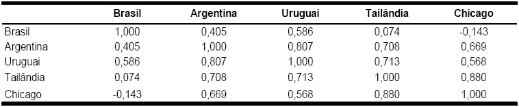 Para melhor compreensão das dinâmicas observadas no Gráfico Nº 3, e antes de iniciar a discussão dos resultados dos testes de cointegração de Johansen e de causalidade de Granger, foram calculados os coeficientes de correlação das variáveis em nível, com o intuito de verificar o relacionamento linear entre os diferentes pares de variáveis (Quadro Nº 1). Pode-se notar que os preços do Brasil possuem fraca correlação com todos os preços, sobretudo em relação à Tailândia e Chicago. Por outro lado, nota-se que tanto os preços da Argentina, como os do Uruguai, apresentam uma correlação mais significativa e positiva com os preços internacionais. Da mesma forma, observam-se correlações mais elevadas entre os preços desses dois países do Mercosul, o que pode ser decorrência de suas próprias características exportadoras, muito focada no abastecimento do mercado brasileiro. Outro ponto interessante a se analisar é a forte correlação encontrada entre os preços da Tailândia e Chicago.