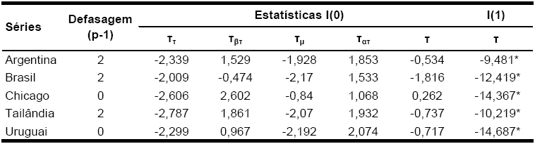 Os resultados obtidos pelo teste da raiz unitária são apresentados no Quadro Nº 2. Os testes de AIC e SBC sugerem um modelo auto-regressivo de ordem 2 – AR(2) para a série de preço de arroz da Argentina, do Brasil e da Tailândia, e de ordem 0 – AR(0) para os preços do Uruguai e de Chicago (Quadro Nº 1). Tal resultado sugere que na formação dos preços de Argentina, Brasil e Tailândia, há influência dos preços passados com defasagem dois meses.