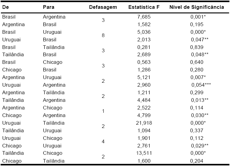 Por fim, pode-se notar que a utilização dos preços de Chicago e, sobretudo da Tailândia, como referência internacional são bons indicadores para entender a dinâmica e relação de preços entre mercados regionais e o mercado internacional, uma vez que ambos mostraram relação de causa e efeito sobre a maior parte dos preços das praças do Mercosul. Além disso, os preços tailandeses mostraram uma relação de causalidade sobre os preços de Chicago, sugerindo que os preços futuros tendem a acompanhar as oscilações no principal mercado mundial (Ásia) e em seu principal exportador.