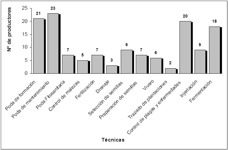 Con el fin de valorar la aplicación de las técnicas aprendidas por los productores/acopiadores, cada uno de ellos indicó cuáles eran las técnicas que más recordaban. Estas fueron sus respuestas: poda de mantenimiento, poda de formación, control de plagas y enfermedades y fermentación, le siguen en menor importancia injertación y selección de semillas (Gráfico Nº 1). Con respecto a la frecuencia de aplicación de dichas técnicas, que se pueden realizar más de una vez al año, respondieron que 40% las efectúan de dos a cinco veces en el año (en este caso, la poda de mantenimiento y el control de malezas).