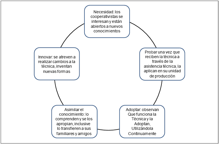 Al visualizar las etapas o fases anteriormente mencionadas, en la primera la mayoría de los productores/acopiadores (96%) se interesa en nuevo conocimiento; en la segunda, (100%) aplicaron las técnicas aprendidas a través de los cursos o charlas; mientras que en la tercera todos asimilaron –es decir, se las apropiaron al incorporarlas como manejo – las técnicas de poda de mantenimiento, poda de formación, poda fitosanitaria, control de plagas enfermedades y fermentación. Un rasgo relevante de ese proceso de apropiación es que la mayoría de los encuestados (92%) transmite los conocimientos aprehendidos a familiares y amigos. Con respecto a la última fase –que consiste en la innovación–, una pequeña parte (20%) de los encuestados emplean su creatividad y experimentan cambios en las técnicas con el fin de lograr mejores resultados.