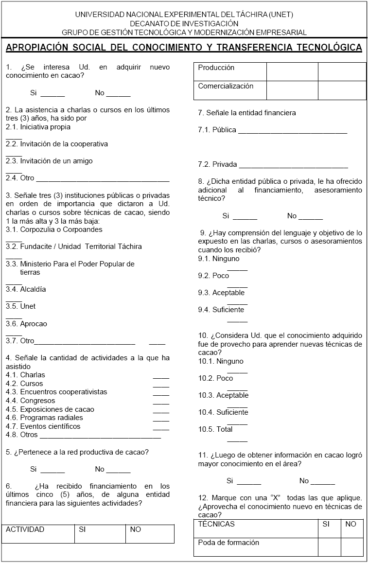 La encuesta para la recolección de los datos consistió en un cuestionario impreso, que permite la realización de una diversidad de preguntas, tanto con respuestas cerradas como de selección y algunas abiertas, con el fin de profundizar en aquellos aspectos donde los cooperativistas tengan la posibilidad de opinar ampliamente. Con estas últimas se pueden identificar categorías emergentes que le dan a la investigación valor agregado. El cuestionario se diseñó a partir de las variables consideradas que influyen con respecto a la apropiación social del conocimiento, basado en la operacionalización de variables (Anexo Nº 1). Fue validado por tres expertos –respectivamente– en las áreas de estadística, apropiación social del conocimiento y transferencia tecnológica. Se elaboró una prueba piloto, que sirvió para comprobar si la encuesta recogía las respuestas a las variables planteadas, así como para probar su pertinencia, eficacia y condiciones de aplicación y procedimientos. Esta etapa permitió estimar la confiabilidad y validez iníciales, así como rediseñar el instrumento. Una vez culminada la fase de ejecución y aplicación en las comunidades a los cooperativistas objeto de estudio, se realizó el proceso de codificación o tabla de tabulación y procesamiento de los datos a través del software estadístico SPSS versión 15.0. Se realizaron además algunos gráficos para la presentación de los hallazgos más destacados del estudio y finalmente se analizaron los resultados obtenidos.