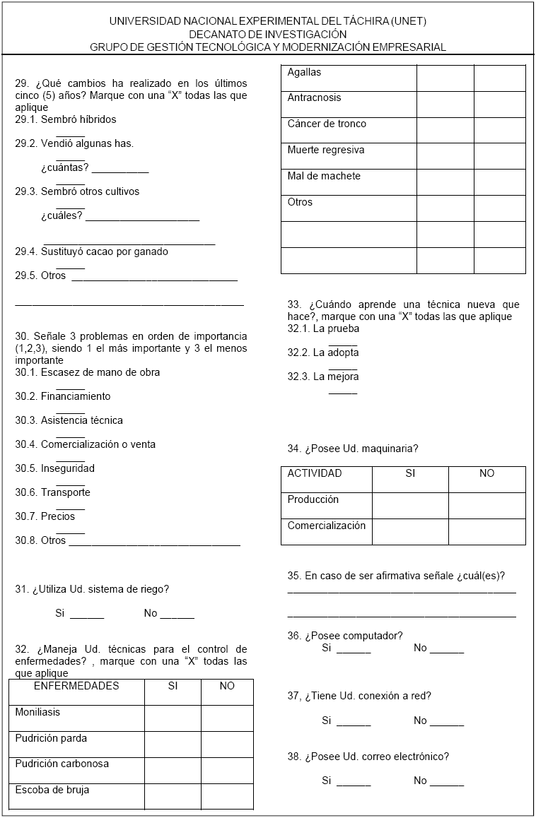 Dada las características de la población y muestra se empleó la técnica de la «encuesta», cuyo uso es considerado «como exclusivo para las ciencias sociales, partiendo de la premisa que si deseamos estudiar algún aspecto sobre el comportamiento de las personas, lo correcto es preguntárselos directamente a ellas» (Tamayo, 2002, p. 110). La selección de esta técnica se debió a que permite reunir a muchas personas en pocos momentos, lo que resulta beneficioso a efectos de este trabajo, dada las distancias de las comunidades y las dificultades de asistencia a las convocatorias que se pudiesen convenir por parte de los cooperativistas.