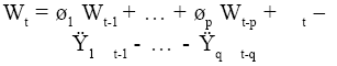 (11)Onde: W são valores observados nos diferentes tempos; ø constante da parte auto regressiva; constante da parte de médias móveis; Ɛ erros encontrados ao longo do tempo. A ordem do modelo dependerá da quantidade de tempos utilizados em cada parte específica.