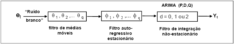 O modelo ARIMA foi desenvolvido nos anos 1970 por George Box e Gwilym Jenkins os quais pretendiam descrever mudanças em uma série temporal por meio de uma abordagem matemática (Sato, 2013). Um modelo ARIMA, segundo Box & Jenkins (1970), têm três partes: a parte auto regressiva (AR), a parte de integração (I) e a parte média móvel (MA), embora nem todas as partes sejam sempre necessárias. A metodologia de Box-Jenkins (BJ), tecnicamente denominada como metodologia ARIMA, utiliza-se da análise probabilística ou estocástica, onde os valores futuros são estimados com base nos valores passados ou defasados e dos termos de erros estocásticos (Gujarati & Porter, 2011). Para a construção de um modelo ARIMA (p,d,q) que represente uma série temporal Yt: são necessários os filtros de médias móveis (parâmetro q), auto regressivo estacionário (parâmetro p) e o de integração não-estacionário (parâmetro d). A Figura Nº 1 representa esse conjunto de filtros aos quais associam-se os parâmetros do modelo, o ruído banco pode ser interpretado como sendo os erros aleatórios que interferem no sistema (Netto, 2015).