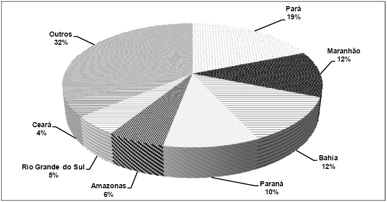 Porém cabe ressaltar que com base na quantidade produzida em toneladas do produto, no ano de 2013 ocorre uma inversão na ordem de importância dos estados, sendo que o estado do Paraná fica em segundo lugar com uma produção de 3,7 milhões de toneladas perdendo apenas para o Pará, que produziu 4,6 milhões de toneladas. O estado do Maranhão foi o menos produtivo dos quatro produzindo 1,3 toneladas enquanto que a Bahia produziu 1,8 toneladas naquele ano; a soma das quantidades também representa mais de 50% do total nacional.
