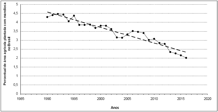 Ao se avaliar os dados de Percentual de área destinada ao cultivo de Mandioca no Brasil, percebe-se uma alarmante redução de área de cultivo ao longo dos anos, sendo que o valor de 2,35% foi o valor indicado para o ano de 2013 (IBGE, 2015). Silva (2013) atribui a redução de área destinada ao cultivo da mandioca à uma concorrência por área com culturas como o milho e a soja, que vêm apresentando expressivos aumentos de áreas em diversos estados do País.