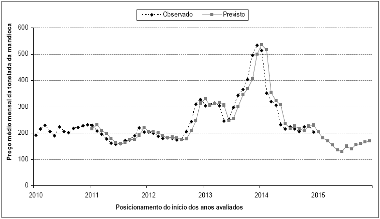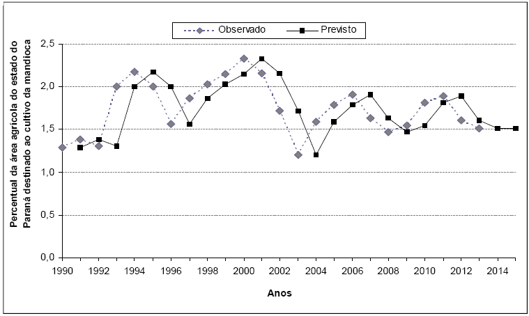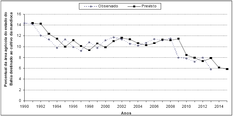 A previsão de área agrícola brasileira destinada ao cultivo de mandioca com base na equação de regressão seria de 2,63% para 2014 e de 2,55% para 2015, o que indica um aumento em relação a 2013, porém não voltaria ao valor de 2,79% observado em 2012. Essa redução tem sido percebida por economistas que destacam o aparecimento de problemas de abastecimento nas indústrias do setor. Os resultados reais disponibilizados pelo IBGE (2017) informaram dados ainda mais preocupantes, pois no ano de 2014 o valor foi de 2,26% e em 2015 de 2,16%. Isto confirma a redução da área destinada a cultura da mandioca no Brasil.