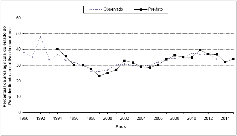 Iniciou-se a avaliação pelo estado do Pará, que destina uma maior área e é o maior produtor de mandioca nacional. A produtividade média daquele estado no ano de 2013 foi de 15,29 toneladas por hectare, responsável em 2013 por 21,51% da produção nacional (IBGE, 2015). De acordo com Alves & Modesto Júnior (2013), a produção de mandioca daquele estado é em sua grande maioria destinada à produção de farinha, sendo que em 2013 o Pará produziu apenas 3.000 toneladas de fécula, o que representou 0,6% da produção nacional. Observou-se que durante todo o período de dados levantados para a realização desse estudo, grande parte da área agrícola do estado foi destinada ao cultivo da mandioca, tendo inclusive chegado no ano de 1992 a um valor próximo a 50% da área cultivável do estado, que segundo o IBGE é de 888.463 hectares. Porém, ao longo da maior parte do tempo avaliado, a ocupação ficou entre 20 e 40% da área agricultável do estado.