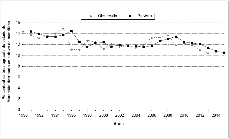Como os valores calculados pelo método de suavização exponencial para esse estado se aproximaram mais dos reais, optou-se por apresentar as previsões para os anos de 2016 e 2017 por ele. Os resultados da previsão indicam um percentual de área de plantio de mandioca para 2016 de 9,704 com limites de confiança entre 7,64 e 11,76% e para 2017 percentual de 9,701 com limites de confiança de 7,67 a 11,72%. Indicando que a área de plantio de mandioca para o estado do Maranhão não tem perspectivas de apresentar grandes alterações ao longo dos dois anos para os quais se fez a previsão.